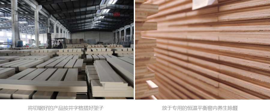 大卫F★★★★地板采用精度除醛技术,将切锯好的产品按井字格搭好架子,使产品每层能独自呼吸,后放于专用的恒温平衡窑中,设定40±5℃的温度中处理6天以上,关闭温度让其自然降温至20-25℃,在自然空气湿度中养生7天后转入下一工序生产。这个过程可以加快产品剩余的甲醛挥发,迅速降低甲醛含量。