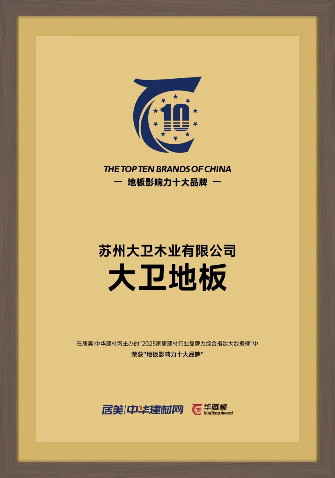 近日,由居美丨中华建材网主办的“华腾杯”2025家居建材行业品牌力综合指数大数据榜正式揭晓。在这场行业评选中,大卫地板再次凭借卓越的综合实力荣获“地板影响力十大品牌”称号。这已是大卫地板连续14年获此殊荣。在当下变革加剧的市场环境中,能够持续保持领先地位,体现的是企业坚持长期主义、专注品质与创新的核心价值。